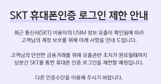 29일 관련 업계에 따르면 KB손해보험은 오후 6시부터 SK텔레콤을 통한 인증을 중단할 예정이다. NH농협생명은 앞서 전날 오후 6시부터 SK텔레콤 인증을 중단했다.