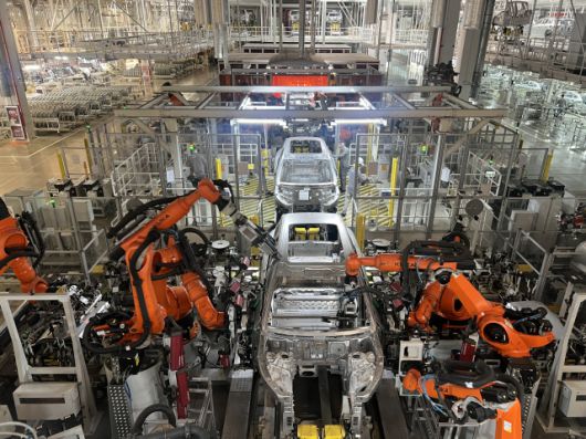 차체 작업장으로 향하자 곳곳에서 무인운송로봇(AGB)이 축구장 13배가 넘는 면적을 오가며 문짝·보닛 등을 쉴 새 없이 옮겼다. 생산 라인 앞에 AGB가 멈추자 대형 로봇팔은 해당 부품을 옮겨 조립에 들어갔다. 차체 작업장에 설치된 로봇만 941개에 달한다고 공장 관계자는 설명했다. 압권은 차량 뼈대에 4개의 문짝을 동시에 조립하는 과정이다. 차체와 문짝의 정밀한 측정을 위해 3D 카메라가 장착된 로봇이 ±0.5㎜의 오차로 볼트와 너트를 조여 98초 만에 차체를 완성한다. 로봇팔은 시간을 단축하기 위해 조립이 끝나는 동시에 다음 차체가 오기 전 문짝을 미리 준비했다. 양 이사는 “인간의 작업과 비교할 때 조임과 섀시 조립 같은 고정밀 작업을 로봇이 훨씬 더 정교하게 수행할 수 있다”며 “운영 효율성과 안정성은 수동 작업에 비해 훨씬 높고 정확도와 합격률은 100%에 가깝다”고 자신했다.