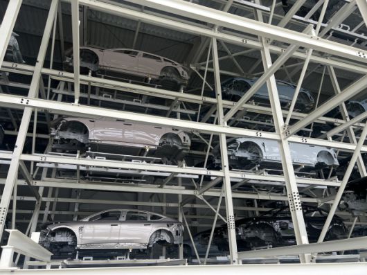 23일 찾은 니오의 F2공장은 전시장과 연결된 구름다리를 지나자 거대한 블록마다 들어선 차체가 눈길을 사로 잡았다. ‘매직 큐브’라 불리는 차체 저장 공간이다. 총 6층 높이로 구성된 이곳에는 700대의 차체가 보관된다. 차체 작업장에서 조립된 차량의 뼈대는 도색 작업까지 마친 뒤 이곳으로 이동한다. 각각의 칸에는 니오의 8개 모델이 색상별로 대기하고 있다가 고객의 주문과 동시에 생산에 들어간다.