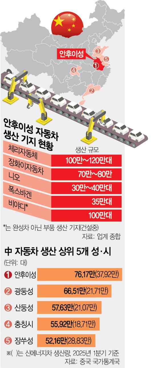 안후이성은 기존 JAC·체리자동차는 물론 전기차로의 전환에 발맞춰 니오·폭스바겐 등 투자를 유치하며 성 전체를 자동차 클러스터로 조성하고 있다. 세계 최대 전기차 업체 비야디(BYD)는 허페이 공장에 이어 신에너지차 전용 자동차 부품 산업단지도 만들고 있다. 그 결과 10년여간 중국 자동차 생산 1위를 차지했던 광둥성을 제치고 올해 1분기에는 31개 성·시 중에 최대 자동차 생산기지로 등극했다. 신에너지차 생산 비중은 50%에 육박해 다른 지역을 압도하는 수준이다.