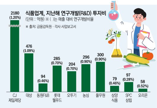 국내 주요 식품기업들이 지난해 투자한 연구개발(R&D) 비용이 대부분 매출의 1%에도 미치지 못한 것으로 확인됐다. 특히 10곳 중 9곳은 전년 대비 연구개발비를 늘리기는 했지만, 이마저도 찔끔 수준이었다. 식품업계 1위인 CJ제일제당도 연구개발 비용을 예년보다 줄였다. 식품업계가 지난해 원재료 가격 급등을 이유로 제품 가격 인상에는 적극적이었지만, 신제품 개발을 위한 연구개발 투자에는 소극적이라는 비판이 나오는 이유다.