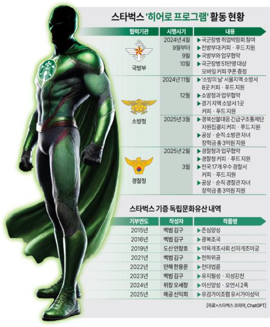 스타벅스 파트너들은 그간 전국 방방곡곡에서 활동하는 히어로들을 직접 찾아가 스타벅스 커피와 푸드 등을 전하며 응원 메시지를 보냈다. 1년간 전국 히어로를 방문해 전달한 물품은 커피 약 2만3000잔, 푸드는 약 2만1000개에 달한다.