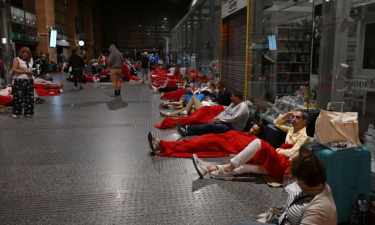 스페인과 포르투갈 등 이베리아반도 전역과 프랑스 남부 등에 대규모 정전이 발생해 주요 인프라가 마비된 가운데 28일(현지시간) 스페인 코르도바의 기차역에 발이 묶인 여행객들이 담요를 덮고 역 바닥에 누워 있다. 코르도바=AFP연합뉴스 |