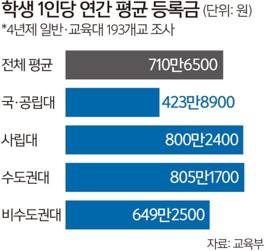 사립대 등록금은 800만2400원으로 전년보다 4.9%(37만700원) 올랐고, 국·공립대는 전년보다 0.7%(2만7500원) 오른 423만8900원으로 추산됐다. 국·공립대 중에선 교대 10곳과 서울시립대·한국교원대만 등록금을 인상한 것으로 확인됐다.