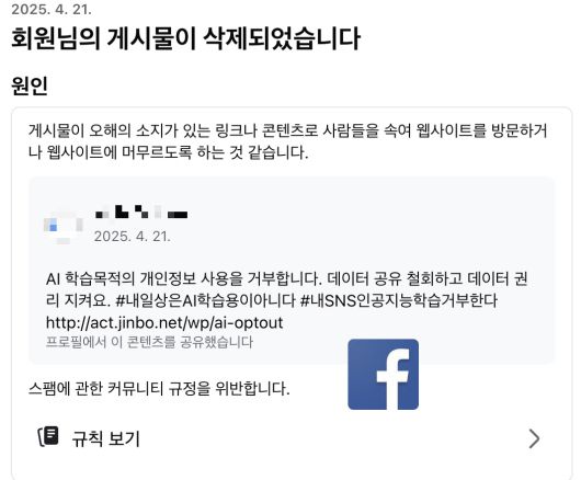 고씨는 이런 취지의 캠페인을 알리기 위해 글을 올렸으나 약 30분 뒤 페이스북 게시글이 삭제됐다. 페이스북은 “게시물이 오해의 소지가 있는 링크나 콘텐츠로 사람들을 속여 웹사이트를 방문하거나 웹사이트에 머무르도록 하는 것 같다”며 스팸에 관한 커뮤니티 규정을 위반했다고 밝혔다. 29일 온라인업계에 따르면 규정 위반과는 무관한 게시글이 페이스북에서 임의로 삭제되는 사례가 발생하고 있다. 불투명한 운영·관리로 공익적 정보 전달이 차단될 수 있다는 우려가 나온다.