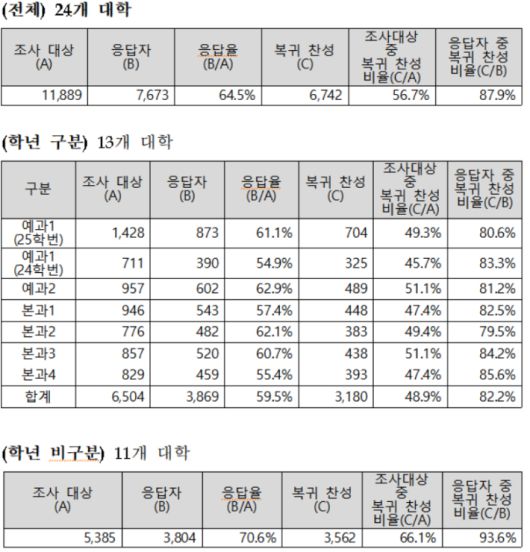 이날까지 조사가 완료된 28개 의대 가운데 24개교의 자료를 취합한 결과, 전체 조사 대상 1만1889명 가운데 56.7%인 6742명이 복귀에 찬성한다고 답했다. 응답자 7673명만 놓고 보면 찬성 비율은 87.9%에 달했다.
