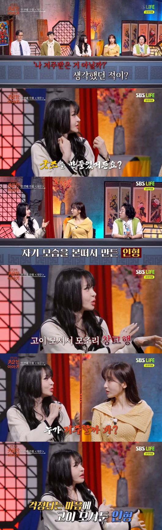 서유리는 "저도 '저주받았구나' 생각을 했던 게 굿즈를 만들었다. 제 모습을 딴 인형을 100개로 만들었다. 팬클럽 친구들에게 선물을 주거나, 일부는 판매하려고 만들었는데 고이 모셔서 창고에 넣어놨다"고 말했다.