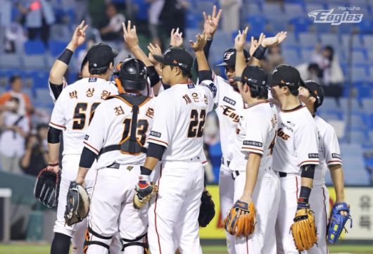 승리를 자축하는 한화 선수들. [사진 = 한화] |