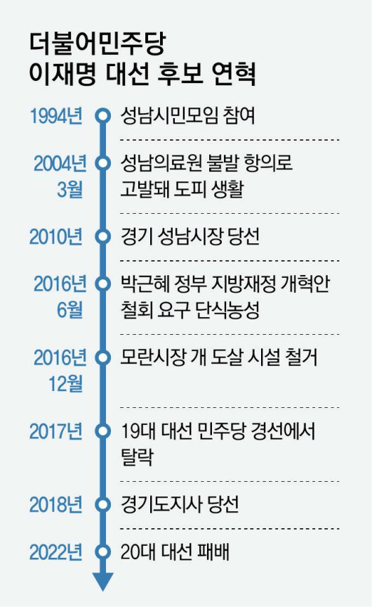 변방의 장수였던 이 후보가 중앙 정치권의 주목을 받은 건 2016년 지방자치단체 예산권을 둘러싼 박근혜 정부와의 갈등으로 11일간 단식 농성을 하면서다. 그해 10월 국정농단 사건이 터지자 이 후보는 제도권 정치인 중 처음으로 박 대통령 하야를 공개 주장했다. 이후 이 후보는 2017년 대선 경선 출마와 2018년 경기도지사를 거쳐 유력 대선 주자로 자리매김했다.