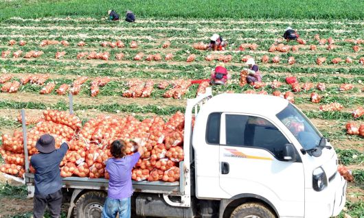 제주 서귀포시 대정읍 신도리 한 밭에서 농민들이 조생양파를 수확해 출하하고 있다. 연합뉴스 |