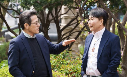김현우 서울경제진흥원(SBA) 대표(오른쪽)와 정병국 한국문화예술위원회 위원장이 기술과 예술을 융합해 새로운 산업이 성장할 수 있도록 하는 방안에 대해 논의하고 있다. SBA·한국문화예술위원회 제공 |