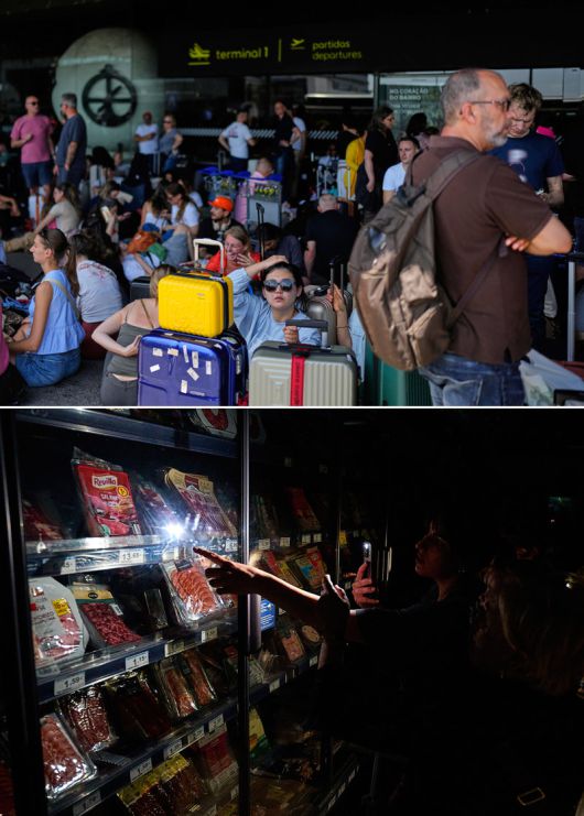 28일 포르투갈 리스본 국제공항이 대규모 정전으로 운영이 중단된 가운데 승객들이 복도에 주저앉아 운항 재개를 기다리고 있다(위쪽 사진). 이날 동시에 정전 사태가 벌어진 스페인 북부 도시 팜플로나의 슈퍼마켓에선 시민들이 스마트폰 불빛을 켠 채 물건을 고르고 있다. 이날 정오 무렵 스페인 수도 마드리드를 비롯한 대부분의 지역과 포르투갈 수도 리스본을 비롯한 일부 지역에서 정전이 발생해 극심한 혼란이 빚어졌다. 리스본·팜플로나=AP 뉴시스