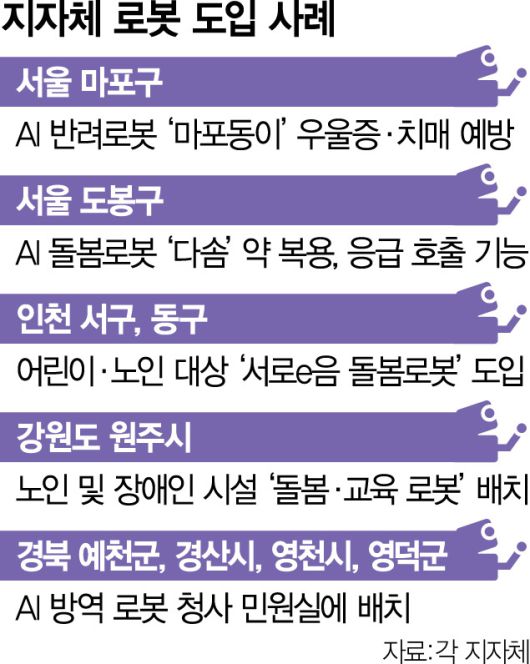 대표적인 분야가 복지사업이다. 초고령화사회로 진입함에 따라 홀로 지내고 있는 독거 어르신들이 늘고 있지만 이들을 전담할 인력은 줄어들고 있어서다. 서울 마포구는 인공지능(AI) 반려로봇을 지역 내 400명의 노인들에게 보급해 정서적 지원과 치매 예방을 꾀하고 있다. 도봉구도 돌봄로봇 ‘다솜’을 저소득층 독거 어르신에게 지원했다. 다솜은 말벗이 돼줄 뿐 아니라 약 복용 알림과 응급 호출 같은 안전 기능까지 갖췄다.