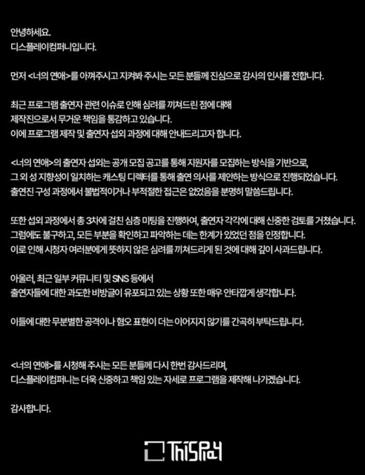 <너의 연애>를 시청해 주시는 모든 분들께 다시 한번 감사드리며, 디스플레이컴퍼니는 더욱 신중하고 책임 있는 자세로 프로그램을 제작해 나가겠습니다. 감사합니다.