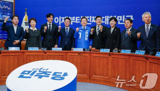 이재명 더불어민주당 대선 후보가 28일 서울 여의도 국회에서 열린 최고위원회의에서 파이팅을 외치며 기념 촬영하고 있다. 2025.4.28/뉴스1 ⓒ News1 안은나 기자 |