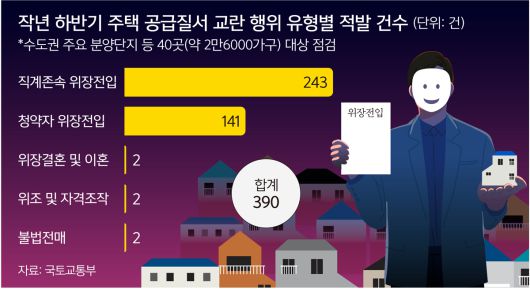 국토교통부는 지난해 하반기 수도권 주요 분양단지 등 40곳(약 2만6000가구)의 주택 청약 및 공급실태를 점검해 이 같은 공급질서 교란행위 390건을 적발했다고 29일 밝혔다. 국토부는 경찰청에 수사 의뢰했으며, 추후 주택법 위반으로 확정되면 형사처벌(3년 이하 징역 또는 3000만원 이하 벌금)과 함께 계약 취소(주택 환수) 및 10년간 청약제한 조치가 이뤄진다.