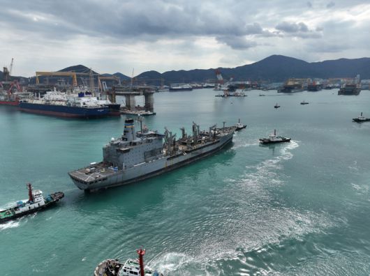 한화오션 거제 조선소로 미국 해군 7함대 소속 유류 보급함 유콘함이 지난 3월 6일 입항하고 있다. [사진 = 한화오션] |