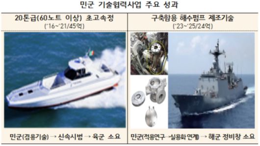 대표적인 민군기술협력사업 성과로는 항만, 연안의 철통 경계태세와 국민 안전 확보에 초석이 될 20톤급(60노트 이상) 차세대 초고속정, 침수환경에 대한 지능형 대응기술로 개발되어 구축함 등 함정의 생존성과 작전 수행 능력 향상에 기여하고 있는 구축함용 해수펌프 등이 있다.