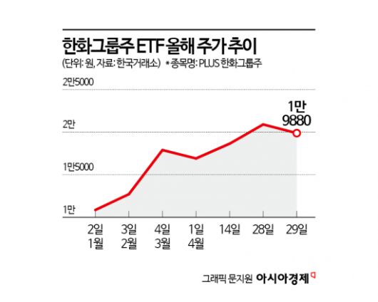 그룹주의 동반 하락에 한화그룹주 상장지수펀드(ETF)도 약세를 보였다. 전일 PLUS 한화그룹주는 4.61% 하락한 1만9880원에 마감했다. 올들어 PLUS 한화그룹주 ETF는 89.24% 오르며 최근 주가가 2만원을 넘었으나 이날 하락으로 다시 2만원 아래로 떨어졌다.