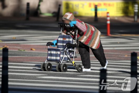 한 노인이 보행보조기에 의지한 채 횡단보도를 건너고 있다.(자료사진, 기사 내용과 무관함) / 뉴스1 ⓒ News1 |