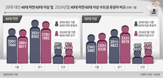 20대 대선 및 2024년말 40대 미만-60대 이상 수도권 유권자 비교 그래픽 |