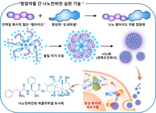 공동연구팀은 도세탁셀과 단백질 특이적 절단 펩타이드를 화학적으로 결합해 자가 조립형 나노입자를 제작했다. 이 나노입자가 종양 특이적 단백질 분해 효소인 카텝신(Cathepsin)에 의해 선택적으로 절단돼 '파클리탁셀 유사체'로 변환되는 과정을 성공적으로 구현해 주목받았다.