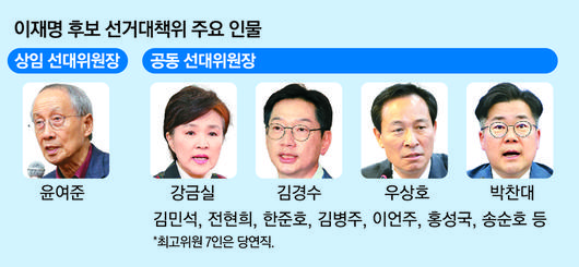 보수 진영 출신인 윤여준 전 환경부 장관이 상임 선거대책위원장을 맡았고, 노무현 정부에서 법무부 장관을 지낸 강금실 변호사가 합류한 점이 특징이다. 이념과 계파를 초월해 ‘통합’에 방점을 찍겠다는 이재명 민주당 대선 후보의 의지를 드러내려는 인선이라는 평가가 나온다.