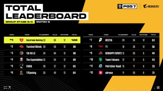 T1은 이날 치킨 없이 순위 포인트 8점, 킬 포인트 12점을 추가하며 토털 포인트 20점을 획득했다. 앞선 그룹 스테이지 경기를 포함한 누적 토털 포인트는 56점으로 전체 8위에 오르며 최대 16개 팀까지 주어지는 파이널 스테이지 진출 가능성을 끌어올렸다.