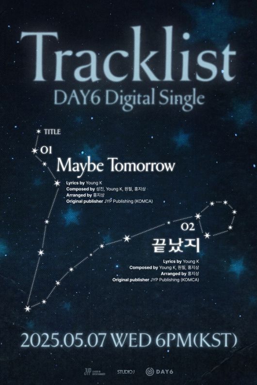 DAY6는 오는 5월 7일 새 디지털 싱글 ‘Maybe Tomorrow’를 발표한다. 이에 앞서 JYP엔터테인먼트는 4월 29일 오후 공식 SNS 채널에 신보 트랙리스트를 게재해 새 앨범을 향한 호기심을 키웠다.