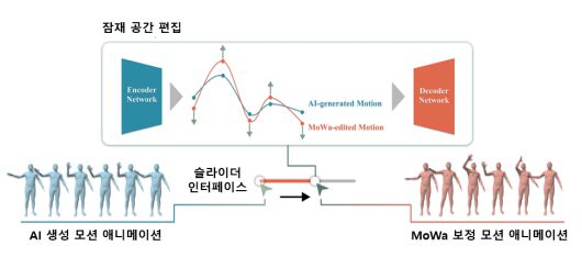 MoWa 시스템 개요. MoWa는 생성형 AI로부터 생성된 모션 애니메이션을 입력으로 받아, 잠재 공간에서 디자이너의 의도에 따라 이를 조정함으로써 모션을 정밀하게 보정하는 시스템이다.[GIST 제공] |