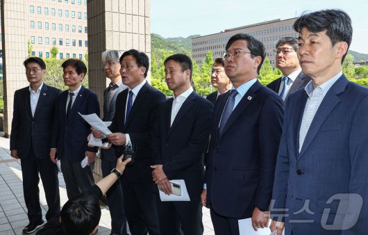 (과천=뉴스1) 김도우 기자 = 더불어민주당 前정권정치탄압대책위원회 소속 의원들과 문재인 전 대통령 변호인단이 30일 경기 과천 고위공직자범죄수사처(공수처)에 이창수 중앙지검장 등 전주지검 수사 관계자에 대한 문 전 대통령의 고발장 제출에 앞서 기자회견을 하고 있다. 2025.4.30/뉴스1