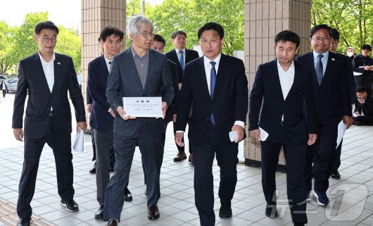 (과천=뉴스1) 김도우 기자 = 더불어민주당 前정권정치탄압대책위원회 소속 의원들과 문재인 전 대통령 변호인단이 30일 경기 과천 고위공직자범죄수사처(공수처)에 이창수 중앙지검장 등 전주지검 수사 관계자에 대한 문 전 대통령의 고발장 제출을 위해 이동하고 있다. 2025.4.30/뉴스1