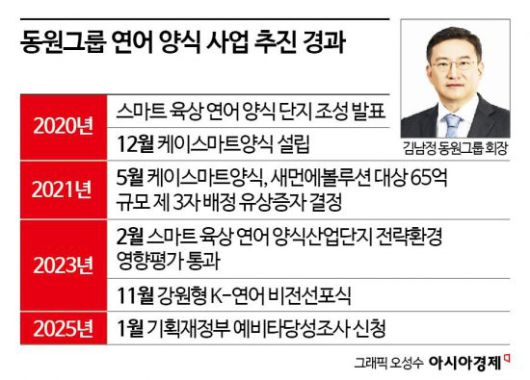 동원산업은 이를 위해 케이스마트양식을 설립했고, 세계적 연어양식업체인 노르웨이 새먼이볼루션과 협력키로 했다. 2023년 8월 착공에 들어가 지난해 말까지 공사를 완료하고 올해부터 연간 2만t 규모의 대서양 연어를 출하할 계획이었다.