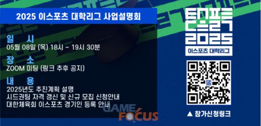 올해 대학리그가 본격적인 시작에 앞서, 오는 5월 8일(목) 오후 6시에 사업설명회를 개최한다. 사업설명회는 대학리그에 관심있는 대학생, e스포츠 동아리, 교수, 대학 관계자 등 누구나 온라인으로 참여할 수 있다. 주요 내용은 ▲2025년도 추진 계획 및 연간 일정 ▲시드권팀 자격 갱신 및 신규 모집 신청 안내 ▲학교 축제 프로모션 지원 ▲’e유니언즈’ 프로그램 소개 ▲e스포츠 경기인 등록 안내 등이다. 사업설명회 참가 신청은 초청장 이미지 내 QR코드 또는 온라인 설문지 링크를 통해 5월 7일(수) 오후 5시까지 가능하다.