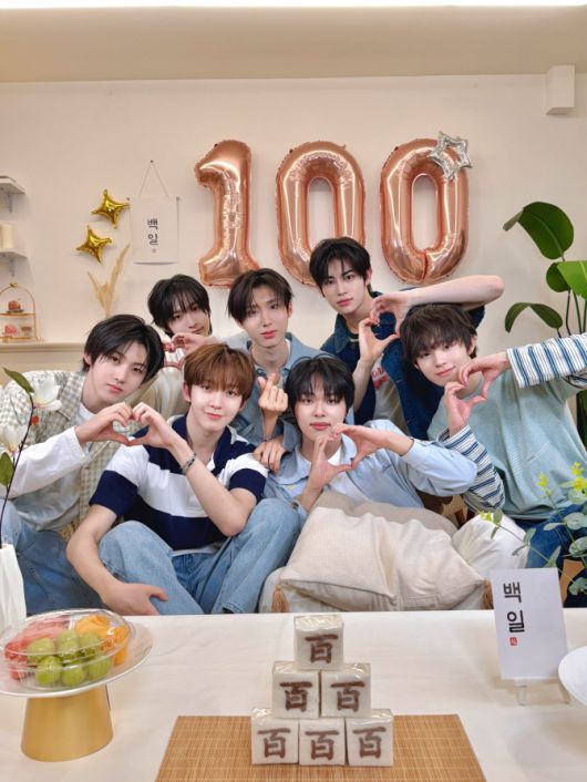 킥플립 데뷔 100일 기념 단체 사진(사진=JYP엔터테인먼트) |