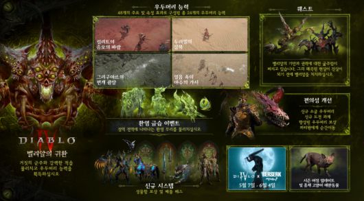 차주 5월 7일(수)부터는 디아블로 IV와 미우라 켄타로 작가의 전설적인 다크 판타지 만화인 ‘베르세르크(Berserk)’와의 콜라보레이션 이벤트가 시작된다. 정예 적을 쓰러트려 베헤리트를 획득해 베르세르크 성물함(Berserk Reliquary)에서 테마별 꾸미기 아이템으로 교환할 수 있는 본 이벤트는 6월 4일까지 참여할 수 있다.