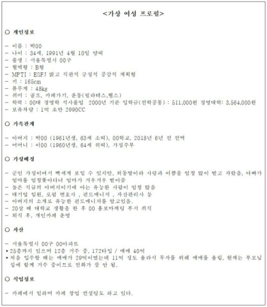 이들 범죄조직은 가상의 34세 여성 B씨를 만들었다. 가상의 여성은 MBTI, 혈액형, 학력, 집안, 키, 몸무게, 가족관계, 재력, 차량 등 세부 정보까지 설정했다. 가상의 여성 B씨를 통해 채팅 앱에서 남성들에게 무작위로 말을 걸었다. 일단, 피해자와 연락을 시작하면 B씨 역할을 맡은 채팅 담당 직원들이 미리 준비한 10∼15일 치 시나리오에 따라 매일 채팅하면서 마치 교제하는 사이가 된 것처럼 신뢰를 쌓았다. 딥페이크 기술을 활용한 영상통화까지 하면서 상대방이 완전히 믿도록 했다. B씨는 자신이 투자를 통해 서울 강남에 40억원대 아파트를 소유하고 있으며, 카페도 운영 중이라고 하면서 상대방에게 “같이 투자 공부를 해보자”라고 권유했다.