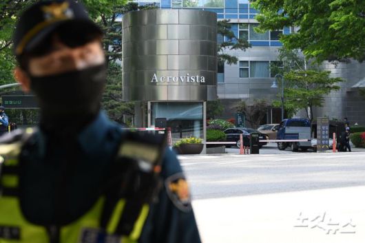 윤석열 전 대통령 부부와 일명 건진법사 전성배 씨 사이에서 일고 있는 각종 의혹을 수사 중인 검찰이 윤 전 대통령 사저 압수수색에 나선 30일 서울 서초구 아크로비스타에 경찰들이 근무를 서고 있다.저작권자 © CBS 노컷뉴스 무단전재 및 재배포 금지