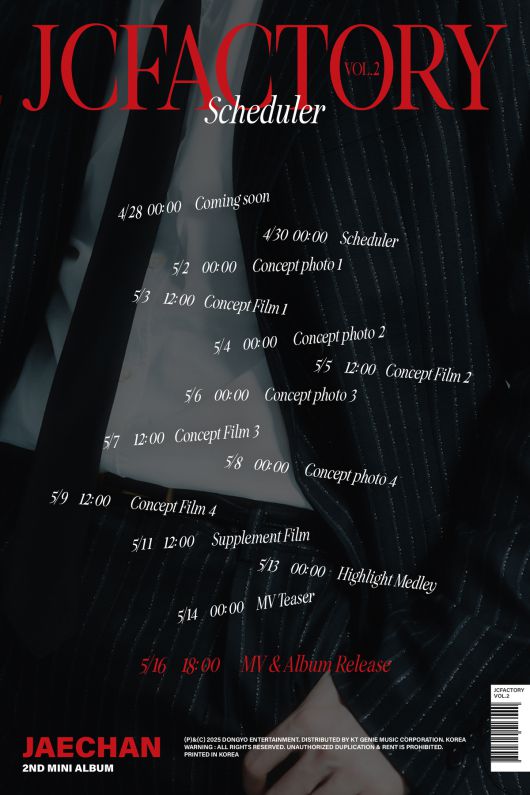 재찬은 오늘(30일) 0시 공식 SNS에 미니 2집 'JCFACTORY vol.2'의 스케줄러를 게재했다. 스트라이프 슈트를 입은 재찬의 실루엣 위로 각 프로모션 일정이 적혀 있어 눈길을 끈다.