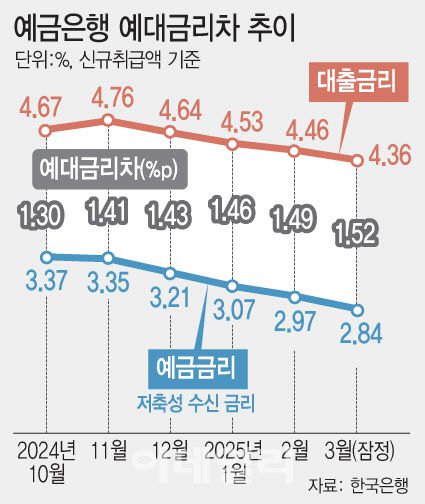 대출금리 하락폭보다 예금금리 내림폭이 큰 흐름이 7개월째 이어지면서 예대금리차는 전월보다 0.03%포인트 벌어지며 1.52%포인트를 기록했다. 잔액 기준 예대금리차는 2.24%포인트에서 2.25%포인트로 0.01%포인트 확대됐다.
