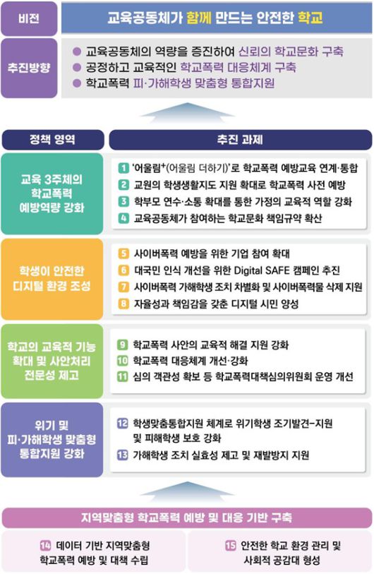 한편, 이번 5차 계획은 현장의 의견과 교육 환경의 변화를 반영해 관계 부처와 합동으로 마련했다. '교육 공동체가 함께 만드는 안전한 학교'를 비전으로 ▲교육 3주체(학생·교원·학부모)의 학교폭력 예방 역량 강화 ▲학생이 안전한 디지털 환경 조성 ▲학교의 교육적 기능 확대 및 사안 처리 전문성 제고 ▲위기 및 피·가해 학생 맞춤형 통합 지원 강화 ▲지역 맞춤형 학교폭력 예방 및 대응 기반 구축의 5대 정책 영역 15개 과제로 구성했다.