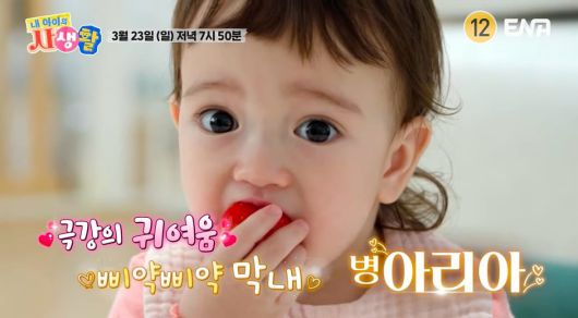 임현주 아나운서가 올린 ENA 예능프로그램 '내 아이의 사생활' 캡처 사진에는 귀여운 비주얼을 자랑하는 아리아의 모습이 담겨 있다.