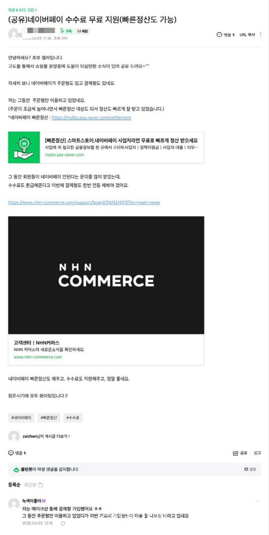 온라인 커뮤니티에 올라온 네이버페이 빠른정산, 수수료 지원 관련 게시글. (이미지=네이버 카페 ‘셀러오션’ 캡처) |