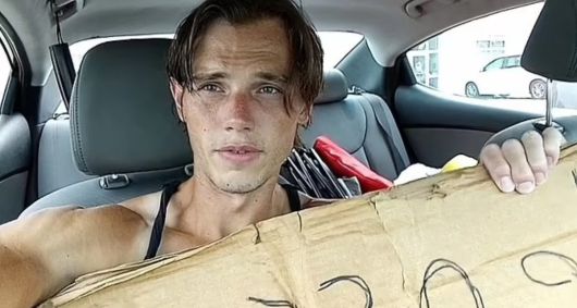 공개된 영상에는 골판지 표지판을 들고 운전자에게 다가가 미소를 지으며 돈을 구걸하는 브래드의 모습이 담겼다.