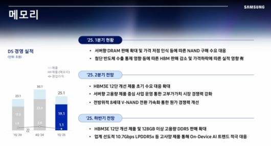30일 삼성전자는 2025년 1분기 실적을 발표했다. 메모리사업부 1분기 매출액은 19조1000억원이다. 전기대비 17% 감소했지만 전년동기대비 9% 증가했다. 메모리 영업이익은 비공개다.