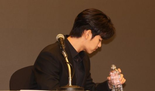 배우 김수현이 지난달 31일 서울 마포구 스탠포드 호텔에서 열린 기자회견 중 물을 마시고 있다. 김태형 기자 xogud555@hani.co.kr |