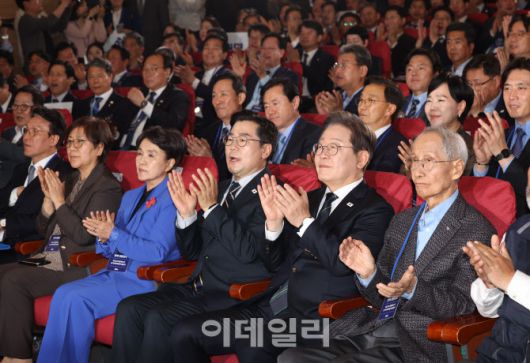 [이데일리 노진환 기자] 이재명 더불어민주당 대선 후보와 윤여준, 박찬대 상임 총괄선거대책위원장 및 참석자들이 30일 오후 서울 여의도 국회 의원회관에서 열린 제21대 대통령선거 중앙선거대책위원회 출범식에서 박수를 치고 있다.