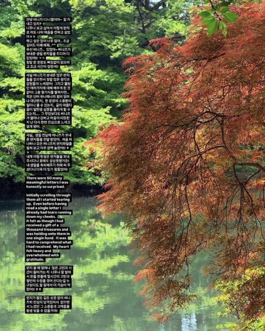 편지를 받은 듯한 포맷과 진솔한 말투는 팬들 사이에서 순식간에 감동을 불러일으켰다. 그는 “버니즈가 준 편지와 메시지들 드디어 다 읽었어요”라며 “아직 한 통도 읽기 전인데 벌써 눈물이 뚝뚝… 이미 가슴이 벅차올라서 모든 걸 받은 그 자체로 눈물이 났어요”라고 털어놓았다.