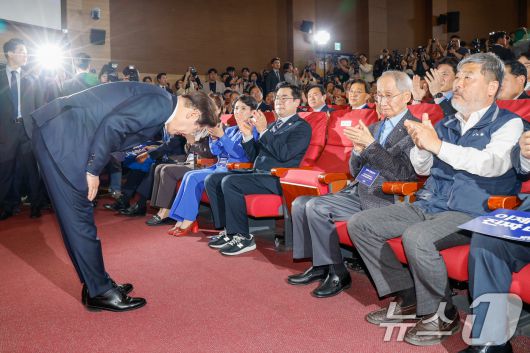 (서울=뉴스1) 안은나 기자 = 이재명 더불어민주당 대선 후보가 30일 오후 서울 여의도 국회 의원회관에서 열린 제21대 대통령선거 중앙선거대책위원회 출범식에 참석해 인사하고 있다. 2025.4.30/뉴스1coinlocker@news1.krCopyright ⓒ 뉴스1. All rights reserved. 무단 전재 및 재배포, AI학습 이용 금지.