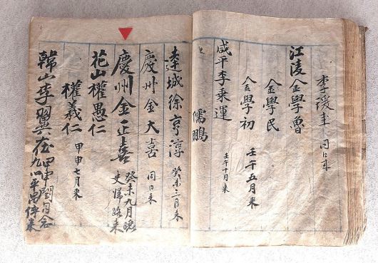 추사 김정희가 사관으로 파견돼 오대산사고의 왕조실록을 바람에 말리는 포쇄 일을 마치고 난 뒤 강릉 오죽헌에 들렀다는 사실을 적은 오죽헌의 방명록 ‘심헌록’의 일부분. 왼쪽 붉은 쐐기 표시가 된 부분이 방명록에 적은 김정희의 이름과 방문 내력을 적은 필적이다. 1823년 오대산 사고 포쇄 뒤 오죽헌을 다녀갔다는 내용으로 힘차고 옹골찬 추사 글씨의 기운을 한눈에 느낄 수 있다. 노형석 기자 |